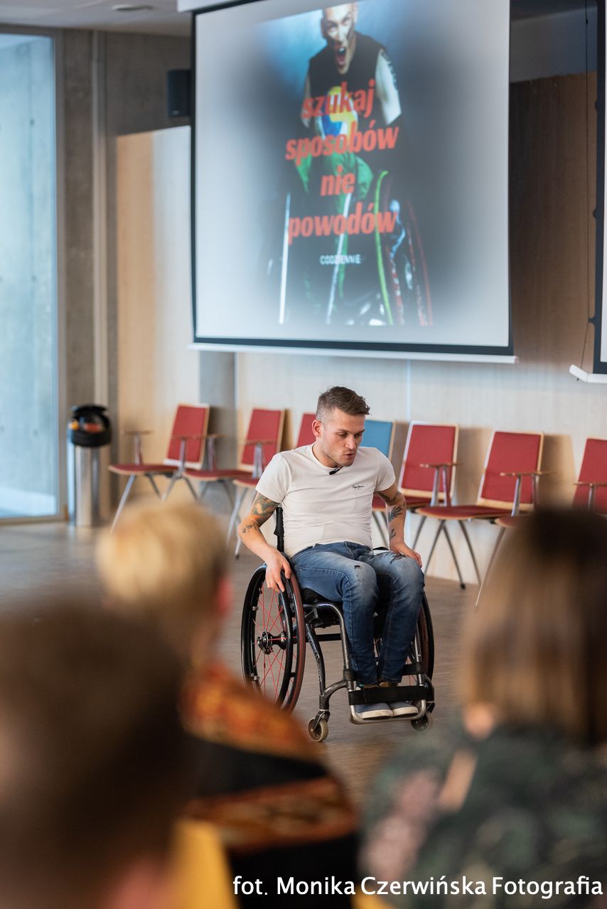 Magiczną, interesującą i niezwykle poruszającą historię swojej kariery prawnika, sportowca, paraolimpijczyka, fundatora przedstawił nasz gość specjalny – Rafał Mikołajczyk w wystąpieniu „Jak zostać bohaterem swojej przyszłości? – Historia mojej kariery”. Pięknie zapowiedziała go Paulina Żulińska mówiąc, że Rafał jest człowiekiem, który trafiając w swojej wędrówce na kłody, buduje z tych kłód mosty.